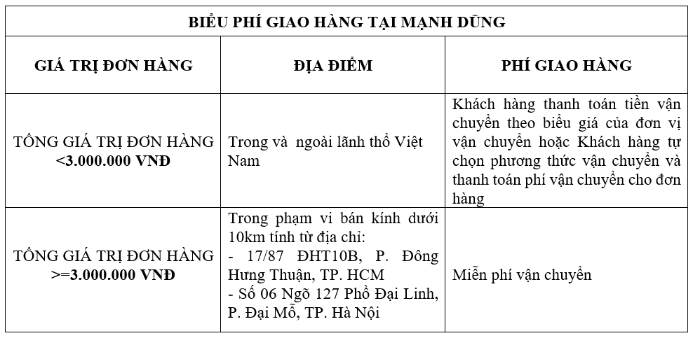 – Trường hợp Khách hàng muốn vận chuyển qua hình thức COD (giao hàng rồi thanh toán) Mạnh Dũng sẽ sử dụng dịch vụ của Viettelpost, cước phí do khách hàng trả cho đơn vị vận chuyển.