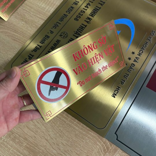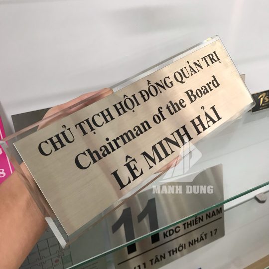 Biển chức danh – biển tên phòng: dùng cho phòng họp, phòng ban, lãnh đạo, dùng cho các bảng chức danh có gắn đế gỗ hoặc đế Mica giúp bảng có sự pha trộn giữa truyền thống và hiện đại