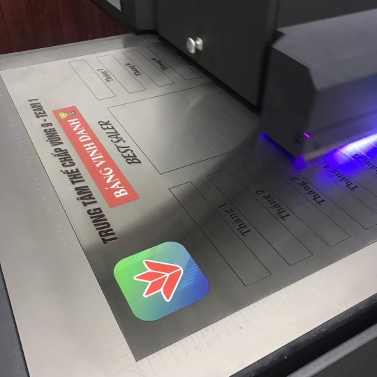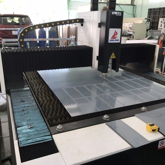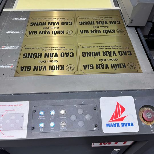 Bước 03: Gia công cắt – khắc – in: sử dụng công nghệ khắc laser, in UV, ăn mòn hóa chất, ép nổi 3D tùy từng loại biển.