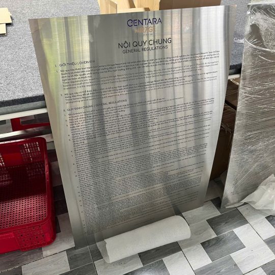 Biển inox xước: bề mặt được xử lý xước mờ sang trọng, phù hợp cho văn phòng, khách sạn, biển này thường khá phổ biến và dễ dùng